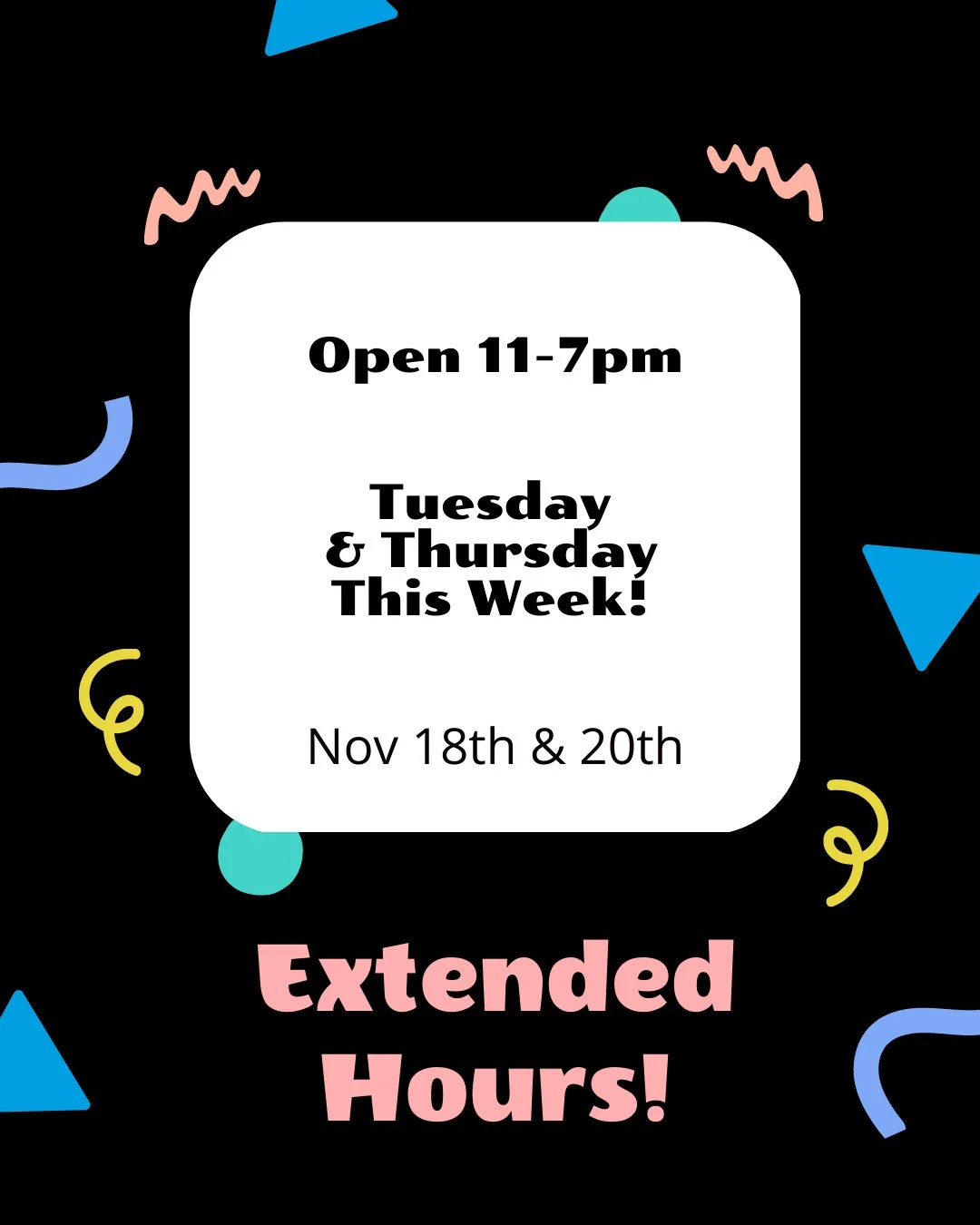 Extended Hours: We're open late! 11am-7pm on Friday and 10am-6pm on Saturday.